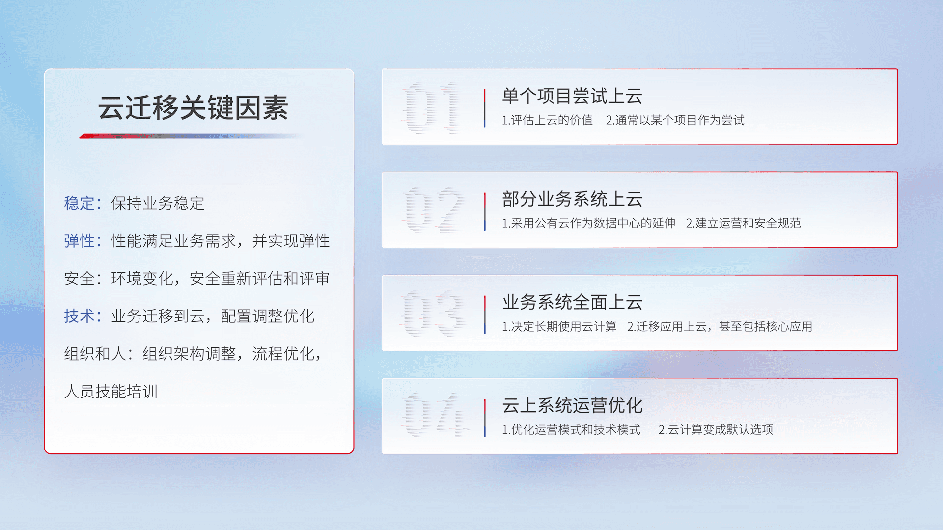 结合实际业务,,从规划设计、、、、云平台选型、、、云原生改造、、、数据迁移、、集成交付,,,迁移全过程为客户识别最佳上云路径,,做好风险识别管理,,,设计网络架构、、、身份权限、、、安全审计合规、、、操作审计、、日志审计、、、、监控告警策略、、、多站点容灾设计等,,对云上基础设施进行整体规划,,提升IT治理水平,,以满足弹性、、、高可用、、、、高性能的需求。。。。
