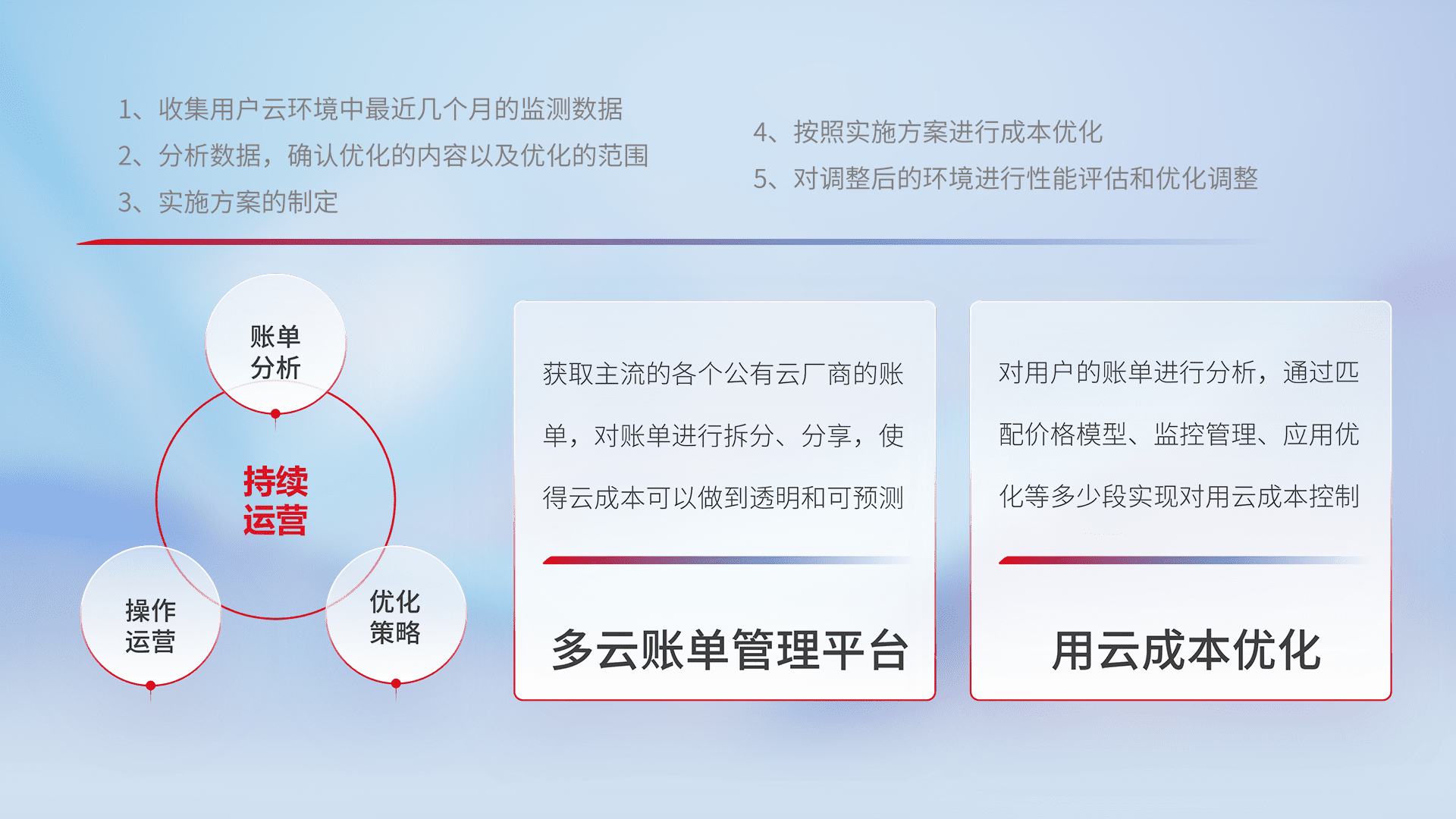 通过多云纳管,,,以统一的资源数据模型把客户的云资源进行抽象和封装,,,进而实现对多云资源的统一操作,,,,保障云资源管理的可靠性、、、、稳定性与可用性。。。。量身定制化运维内容,,配置、、、开发运维、、、、补丁管理、、备份、、、监控、、、认证和访问管理、、、审计和日常巡检等,,,,保障在用云过程中的可靠度,,,,稳定度以及高可用率。。。。